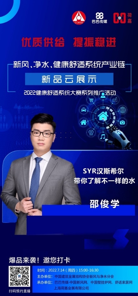 7月14日下午,由中國(guó)建筑金屬結(jié)構(gòu)協(xié)會(huì)新風(fēng)與凈水分會(huì)主辦的凈水、新風(fēng)、健康舒適系統(tǒng)產(chǎn)業(yè)鏈新品云展示活動(dòng)在線以直播的形式舉行。SYR漢斯希爾作為凈水行業(yè)德系高端品牌參加了這場(chǎng)別開(kāi)生面的線上展示會(huì)。